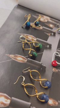 Goldtone earrings featuring a twist design and accented with genuine gemstone bead. These earrings are made with 18kt gold overlay to give a high quality finish to them.
